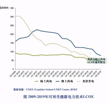 從可再生能源電力技術(shù)LCOE以及電力容量和發(fā)電市場(chǎng)規(guī)模都可以看出,光伏與陸上風(fēng)電LCOE基本相當(dāng)。